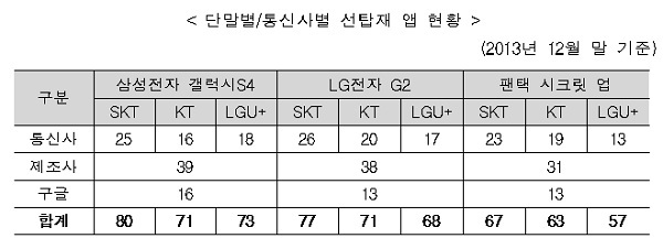 제조사가 선탑재 하는 앱 중 필수앱으로 지정된 것은 전화, 메시지, 카메라, 디지털멀티미디어방송(DMB) 등 14∼18개다. 나머지 13∼24개 앱은 이용자의 삭제할 수 있다.