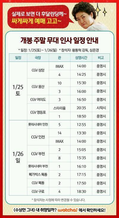 심은경의 무대인사 공지를 본 네티즌들은 “오늘 영화 봤어요. ‘수상한 그녀’ 재밌을 것 같아” “심은경 연기 짱일 듯” “재치도 만점~ 옆에서 말하는 것 같다” 등 다양한 반응을 보였다.