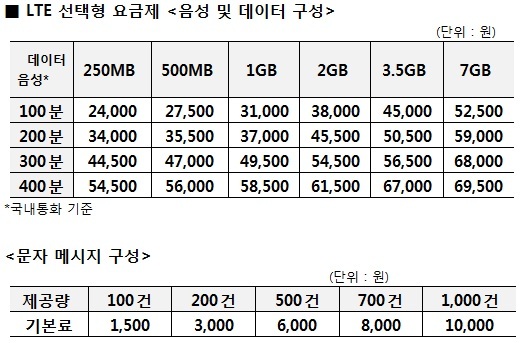 LTE 선택형 요금제는 음성 100분/200분/300분/400분 4가지 중 선택할 수 있고, 데이터의 경우 250MB/500MB/1GB/2GB/3.5GB/7GB 6종 가지 중 택할 수 있다. 문자는 100건/200건/500건/700건/1000건 의 5종류 중 선택할 수 있는 고객 맞춤형 상품이다.