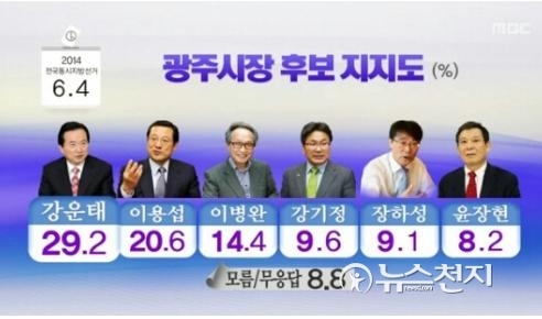 [천지일보 광주=이지수 기자] 강운태 광주시장이 27일 광주 MBC가 발표한 여론조사에서 1위를 달리고 있는 것으로 나타났다.