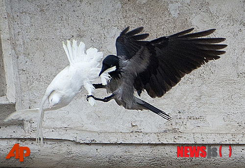 [천지일보=정현경 기자] 프란치스코 교황이 바티칸 사도의 궁 창문에서 날려보내게 한 ‘평화의 비둘기’가 갑자기 나타난 까마귀와 갈매기로부터 공격을 당하는 일이 벌어졌다.