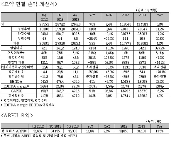 4분기 영업이익은 영업수익 증가 영향에 힘입어 전년동기 대비 73.3% 증가한 1249억 원을 기록했으며 4분기 무선 서비스 ARPU도 직전 분기 대비 2.6% 상승한 3만 5388원을 기록했다.