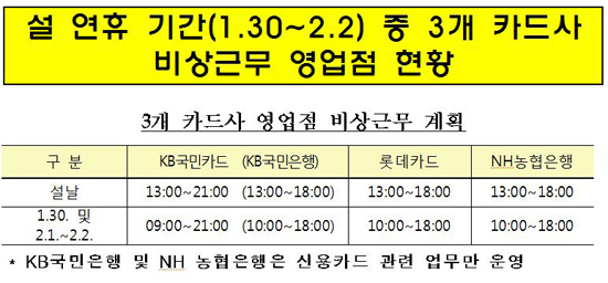 설 연휴 동안 카드 3사가 운영하는 비상근무 시간은, KB국민카드는 오전 9시~오후 9시(설 당일 오후 1시~오후 9시), KB국민은행은 오전 10시~오후 6시(설 당일 오후 1시~오후 6시)까지 근무한다. 롯데카드는 설 연휴에 오전 10시~오후 6시(설 당일 오후 1시~오후 6시), NH농협카드는 오전 10시~오후 6시(설 당일 오후 1시~오후 6시)까지 근무한다.