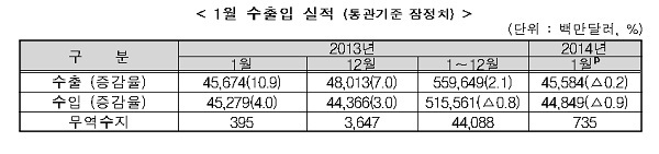 [천지일보=이승연 기자] 2014년 1월의 수출입 증가율이 감소세로 돌아섰다. 조업일수 감소의 영향으로 수출은 4개월 만에, 수입은 2개월 만에 하락세로 돌아선 것. 무역수지는 여전히 흑자를 유지했다.