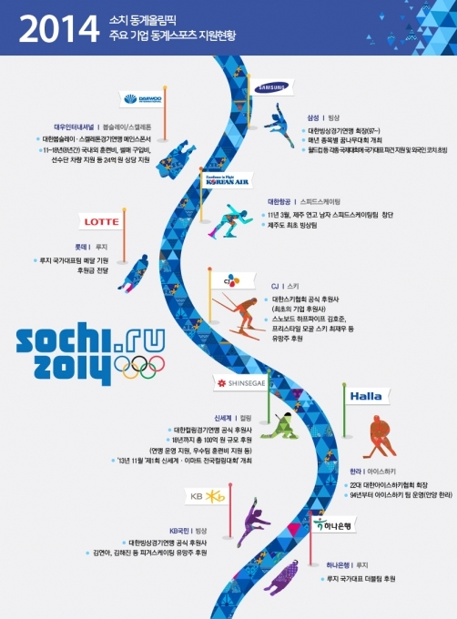 [천지일보=유영선 기자] ‘소치 동계올림픽’ 개막이 나흘 앞으로 다가온 가운데, 우리 기업들이 한국 선수단이 출전한 13개 전 종목에 직·간접적인 후원을 하고 있는 것으로 나타났다.