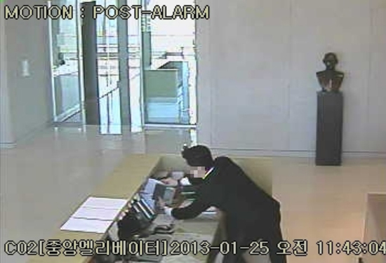 박찬구 금호석유화학 회장의 운전기사 A씨가 보안용역직원 B씨를 매수해 정보를 빼낸 정황이 CCTV에 포착된 것이다.