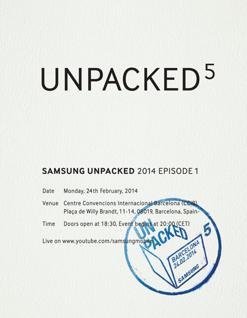 삼성전자는 4일 국내외 언론에 ‘삼성 언팩 2014 에피소드1’이라는 제목의 초대장을 보내 신제품을 공개한다고 알렸다. 공개되는 제품을 명확히 밝히지 않았지만 제목과 아래 찍힌 도장에 숫자 ‘5’가 함께 적힌 것으로 보아 ‘갤럭시S5’ 공개가 유력하다는 전망이다.