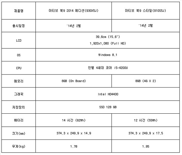 인텔 4세대 코어 프로세서를 탑재한 ‘아티브북9 2014 에디션’은 솔리드 블랙 색상으로 출시되며 국내 출고가는 i5 CPU 기준 200만 원, ‘아티브북9 스타일’은 제트 블랙 색상에 출고가는 i5 CPU 기준 169만 원이다.