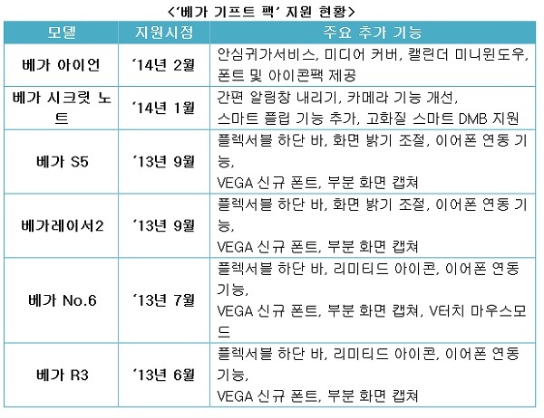이번에 배포되는 베가 기프트 팩을 설치하면 안심귀가서비스, 미디어 커버, 캘린더 미니윈도우, 다양한 폰트 및 아이콘팩을 이용할 수 있게 돼 한층 업그레이드된 최신 사용자 환경을 경험할 수 있다.