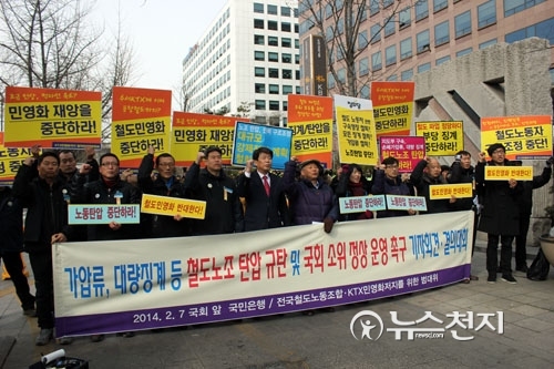 [천지일보=김민아 기자] 전국철도노동조합(이영익 위원장)이 서울시 영등포구 여의도동 KB국민은행 앞에서 ‘노조 탄압 규탄 및 국회 소위 정상 운영 촉구 기자회견’을 7일 개최했다.