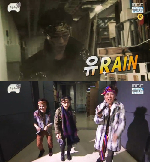 8일 방송된 MBC 무한도전에서 유재석, 박명수, 조세호가 비의 ‘라송’을 패러디한 영상이 공개됐다. 세 사람은 비의 머리띠, 소재 코트, 입술 마크 등 무대 패션을 그대로 따라해 큰 웃음을 선사했다.