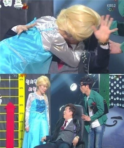 이날 박지선은 금발 가발에 하늘색 드레스를 입고 등장해 엘사가 부른 ‘Let it go’를 특유의 돌고래 소리로 불렀다.