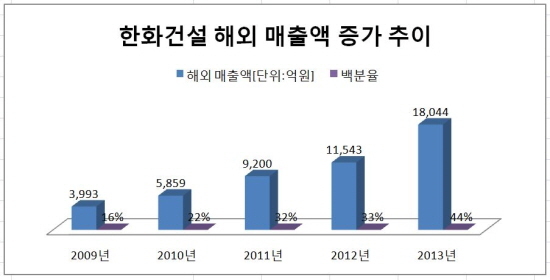 한화건설은 김승연 한화그룹 회장이 2007년 1월 태국 방콕에서 해외사업진출 전략회의를 열어 글로벌화를 본격 지시하면서 매출을 지속적으로 늘리고 있다. 그 결과 지난해 전체 매출 4조 원에서 해외 매출 비중이 44%인 1조 8000억 원을 기록했다. 2015년까지 매년 25%씩 매출 성장을 이뤄 65%까지 끌어올릴 계획이다.