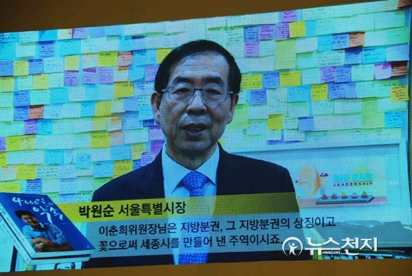 이어 박원순 서울특별시장은 “이춘희 위원장은 지방분권의 상징이고 꽃으로서 세종시를 만들어낸 주역이다. 그 과정의 모든 경험과 지혜가 이 책속에 담겨있다. 이춘희 위원장의 이런 경험과 지혜가 지방자치를 꽃피우는데 핵심적인 지혜가 될 것이다. 대한민국의 분권과 지방자치가 세종시를 기점으로 전국으로 퍼져나가는 계기가 되길 바란다”고 영상을 통해 축하메시지를 전했다.