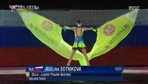 소트니코바(러시아)는 23일(한국시간) 러시아 소치의 아이스버그 스케이팅 팰리스에서 열린 2014 소치 동계올림픽 피겨스케이팅 갈라쇼에 등장, 대형 형광 깃발 2개를 들고 나타났다가 구설수에 올랐다.