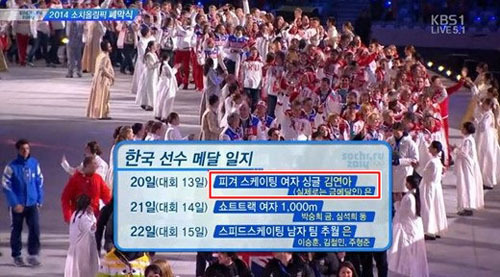 국내 방송국도 김연아가 받아야 할 금메달을 빼앗겼다는 불만을 센스 있게 표출했다. KBS는 김연아에 대해 소개하다가 은메달 획득 소식을 설명할 땐 자막에 ‘실제로는 금메달인’이라는 부가설명을 삽입해 웃음을 자아냈다. SBS는 엔딩 자막을 일부러 소트니코바 얼굴을 가리도록 위치를 조정해 폭소케 했다.