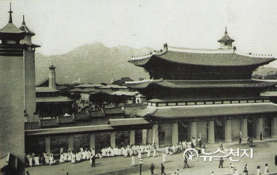 [천지일보=김현진 기자] 광화문 수난은 공진회 박람회 때보다 산업박람회 때에 더 훼손된다. 일제가 광화문 2층 누각을 3층으로 왜곡시킨 모습을 확인할 수 있는 전경이다. 1층 누각이 나머지 누각과 다른 일본식 지붕 형태를 띠고 있다. 한국인에게 입장료를 받고 관람시키고 있는 장면이다.