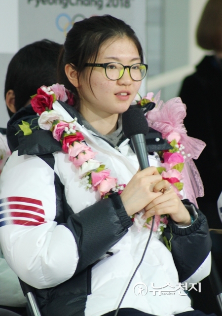 [천지일보=박혜옥 기자] 심석희 선수가 25일 오후 2014 소치 동계올림픽을 마치고 인천국제공항을 통해 입국해 해단식에서 취재진의 질문에 답하고 있다.