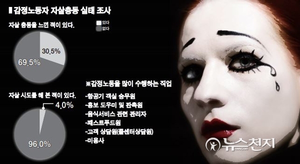 유럽은 미래사회 심리적 10대 위험 요인 중 하나로 감정 노동이 포함돼 있다. 감정노동자들이 감정을 파는 대신 죽음을 사고 있다는 이유다. 환한 웃음 뒤에 숨겨진 눈물, 스트레스, 자살 충동 등이 사회적 문제로 이어지는 셈이다.