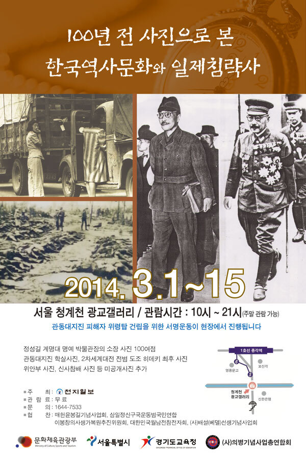 특히 이번 전시에서 천지일보는 정성길 관장과 함께 일본 관동대지진 희생자 위령탑 건립을 위한 서명운동을 벌인다. 이유도 모른 채 강제노역으로 일본에 끌려갔다가 무고하게 죽은 선조들의 넋을 기리기 위한 위령탑을 국민의 힘으로 세워야 한다는 것이 취지다.
