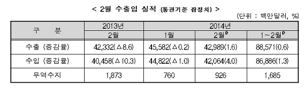 산업통상자원부는 올해 2월 수출이 지난해 같은 달보다 1.6% 증가한 429억 8900만 달러를 기록했다고 1일 발표했다. 수입은 4.0% 증가한 420억 6400만 달러를 기록했다. 무역수지는 9억 2600만 달러로 25개월 연속 흑자를 이어갔다. 올해 누적 흑자는 16억 8500만 달러다.