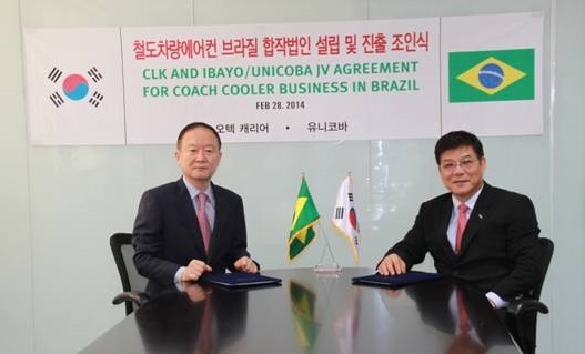 [천지일보=이승연 기자] 오텍캐리어(강성희 회장)가 지난달 28일 브라질 상파울루에 있는 유니코바(UNICOBA)를 방문해 브라질 및 중남미 철도차량용 에어컨 수출을 위한 ‘합작법인 설립 및 진출’ 조인식을 진행했다고 밝혔다.