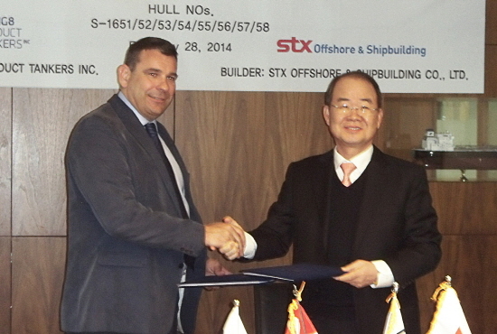 STX조선해양(대표이사 정성립)은 지난달 28일 영국 런던에서 싱가포르 선사인 나빅8(Navig8 Product Tankers Inc)사와 7만 4000DWT급 탱커 12척(옵션 4척 포함)의 수주계약을 체결했다. 계약금액은 총 6200억 원에 달한다.
