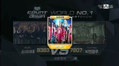 이날 방송에서 소녀시대 타이틀곡 Mr.Mr.는 1위 후보에 올랐던 소유X정기고, 씨엔브루를 제치고 컴백과 동시에 1위에 등극했다.
