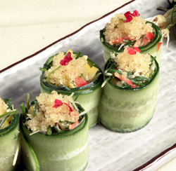 4. 도마에 저민 오이를 깔고 야채를 넣고 김밥 말듯이 싸준 후 세워서 날치알로 장식하고 드레싱을 살짝 곁들인다 .