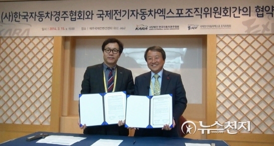 15일 국제전기자동차엑스포 조직위원회와 한국자동차경주협회는 ‘제1회 국제전기자동차엑스포’가 개최된 제주국제컨벤션센터에서 업무협약(MOU) 체결식을 가졌다.