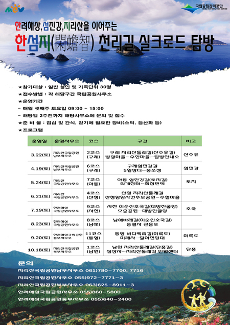 [천지일보=강은영 기자] 국립공원관리공단에서는 정부 3.0 추진과제로, 국립공원과 민관 협치 강화로 영·호남권 지역경제 활성화를 위한 ‘한려해상-섬진강-지리산권 녹색 네트워크 구축’ 사업을 추진하고 있다. 그 일환으로 한려해상권 2개, 지리산권 3개 사무소가 공동으로 한섬지 천리길 실크로드 탐방을 운영한다고 밝혔다.