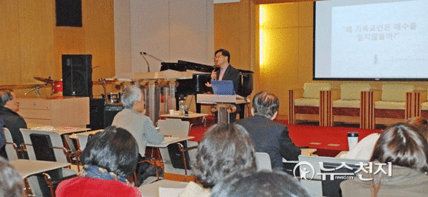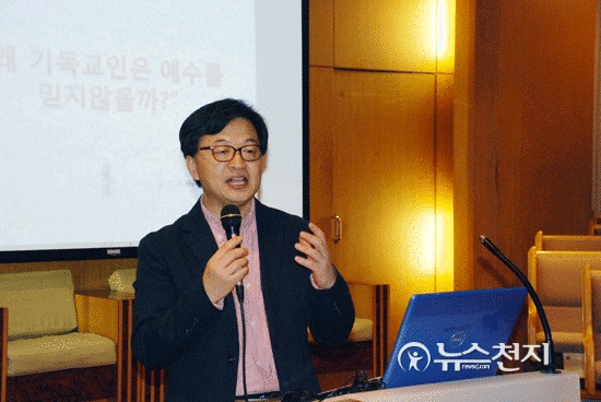 예수나무공동체 대표 김진 목사가 18일 ‘예수인문학: 왜 기독교인은 예수를 믿지 않을까’라는 주제로 서울 종로구 연동교회 베들레헴홀에서 기독인문학 아카데미 강좌를 시작했다.