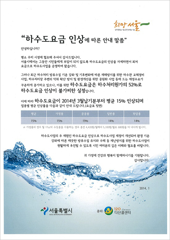 이어서 시는 “이에 따라 하수도 요금이 2014년 3월 납기분부터 평균 15% 인상된다”고 덧붙였다.