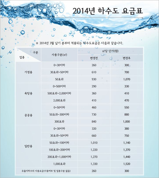 서울시에 따르면, 하수도 요금은 평균 15% 인상됐으며, 용도별로는 가정용 15%, 공공용 19%, 일반용‧욕탕용이 각각 14% 올랐다. 사용량에 따라 가정용은 ㎥당 40∼140원, 일반용은 60~190원, 공공용은 90~190원, 욕탕용은 40~60원이 인상됐다.