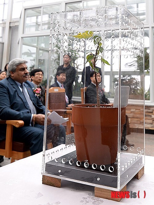 지난 1월 한국-인도 정상회담을 기념해 박근혜 대통령에게 만모한 싱 인도 총리가 양국 우호의 상징으로 기증한 석가모니 보리수나무 후손 묘목 기증식이 19일 경기도 포천 국립수목원에서 열렸다.