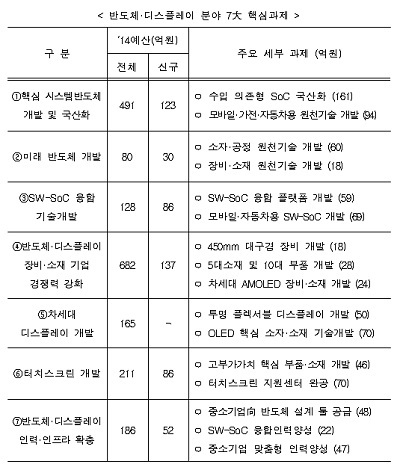 이에 산업부는 이 같은 대내외 환경변화에 대응하고 취약점을 해소할 수 있게 시스템반도체 국산화 등 7대 핵심과제에 집중 투자할 방침이라고 밝혔다. 7대 핵심과제는 ▲핵심 시스템반도체 개발 및 국산화(491억 원) ▲미래 반도체 개발(80억 원) ▲SW-시스템반도체(SoC) 융합기술개발(128억 원) ▲반도체‧디스플레이장비‧소재기업 경쟁력 강화(682억 원) ▲차세대 디스플레이 개발(165억 원) ▲터치스크린 개발(211억 원) ▲반도체‧디스플레이인력‧인프라 확충(186억 원) 등이다.