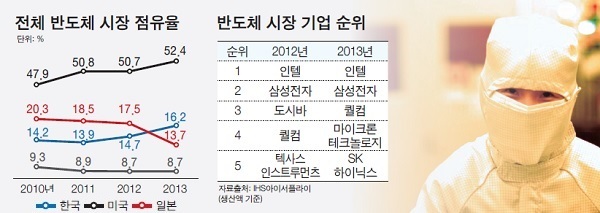 24일 반도체 시장조사기관인 미국 IHS 테크놀로지에 따르면 지난해 한국 업체들의 총 반도체 판매액이 515억 1600만 달러를 기록하며 점유율 16.2%로 일본을 앞질렀다. 한국이 1.5% 성장하며 2위로 올라서는 동안 일본은 전년보다 점유율이 3.8% 하락하면서 13.7%(판매액 434억 3200만 달러)까지 줄었다.