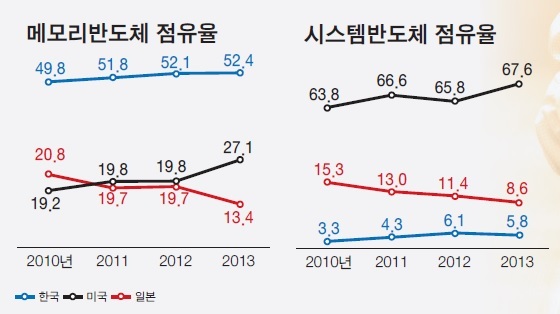 지난해 반도체 시장은 큰 지각변동을 겪었다. 1위(인텔), 2위(삼성전자)는 그대로였지만 전년 3위를 기록한 일본 업체 도시바는 5위권 밖까지 밀려나 7위를 기록했다. 12위를 기록했던 소니 역시 15위까지 추락했다. 반면 7위였던 SK하이닉스는 큰 폭으로 생산액이 증가하면서 5위로 올라섰다. 1년 사이 일본 기업은 5위권 내에서 사라졌고 한국 기업은 1개에서 2개로 늘어났다.