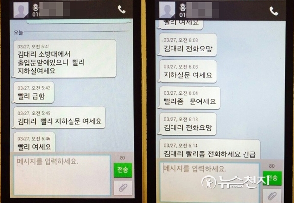 백 씨가 공개한 고인의 휴대폰에는 홍 씨가 ‘김 대리 소방대에서 출입문 앞에 있으니 빨리 지하실 여세요’라고 보낸 메시지가 5시 41분에 도착한 것으로 돼 있다.