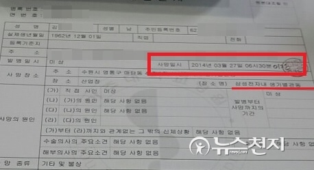 사망시간도 삼성의 발표 시각과 진료 차트에 표기된 시각이 달랐다. 삼성전자는 7시 8분경 고인이 사망했다고 발표했지만, 병원의 진료 기록에 따르면 김 씨의 사망시각은 6시 30분 이전으로 기록돼 있던 것. 본지가 입수한 사망진단서에도 고인의 사망일시는 6시 30분 이전으로 적혀 있었다.