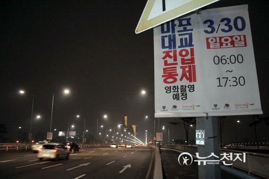 [천지일보=유용주 객원기자] 영화 ‘어벤져스2’ 영화 촬영으로 서울 마포대교가 통제되는 가운데, 30일 밤 마포대교에 영화로 인한 교통통제를 알리는 현수막이 붙어있다.