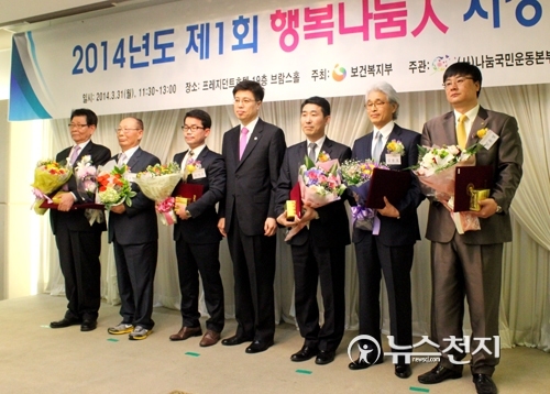 [천지일보=김민아 기자] 서울시 중구 프레지던트호텔에서 개최된 ‘제1회 행복나눔인상 시상식’에서 이영찬 보건복지부 차관(왼쪽에서 네 번째)과 행복나눔인 개인 수상자들이 31일 기념 촬영을 하고 있다.