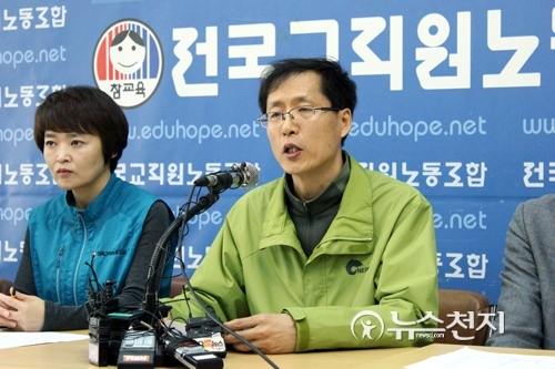 [천지일보=김민아 기자] 전국교직원노동조합이 1일 서울시 영등포구 영등포동 현대플라자 전국교직원노동조합 대회의실에서 ‘불법적 재정지원 자사고 지정철회 촉구 전교조 기자회견’을 개최했다.