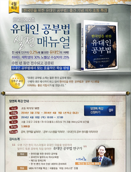 진행은 ‘예즈덤 영재교육’의 원장이자 ‘한국인을 위한 유대인 공부법’의 저자인 이대희 원장이 맡는다.