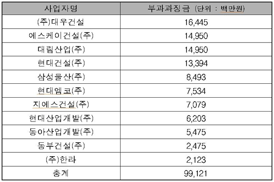 적발된 건설사는 대우건설(과징금 164억 4500만 원), SK건설(149억 5000만 원), 대림산업(149억 5000만 원), 현대건설(133억 9400만 원), 삼성물산(84억 9300만 원), 현대엠코(75억 3400만 원), GS건설(70억 7900만 원), 현대산업개발(62억 300만 원), 동아산업개발(54억 7500만 원), 동부건설(24억 7500만 원), 한라(21억 2300만 원), 남양건설, 금광기업 등 13곳이다.