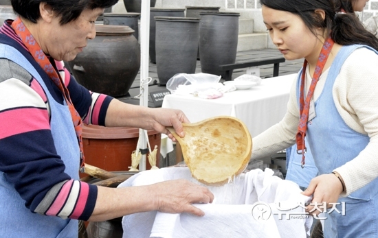 [천지일보=박선혜 기자] 4월의 첫 주말이었던 5일 오후 2시 경복궁 장고에서 ‘궁중 장 담그기’ 행사가 진행됐다. 행사 관계자들이 궁궐을 찾은 국내외 많은 관람객들에게 장 담그기 과정 시연을 하고 있다.