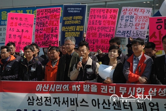 대책위는 “지난달 31일 삼성전자 서비스 아산센터가 폐업을 했다”며 “그동안 노동조합은 물론 아산시의 시민단체들과 지역 정치인들까지 삼성측에 폐업계획을 철회할 것을 요청했지만 삼성은 성의 있는 답변 한마디 없이 폐업을 강행했다”고 성토했다.
