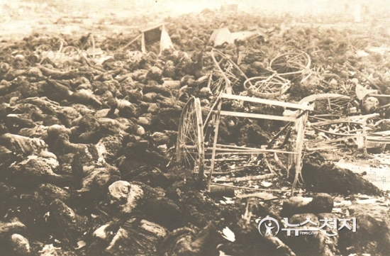 [천지일보=김현진 기자] 이 사진을 볼 때 법리적으로 판독해도 지진으로 이렇게 많은 시신들이 집단으로 죽어있을 수가 없다. 한국인을 살해한 뒤 시신을 옮겨 무차별 불태워 죽인 것은 부인할 수 없는 현장이다. 자전거와 인력거도 주인 잃고 화마 속에서 형체만 보이고 있어 참혹한 장면이다.