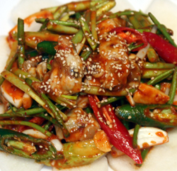 [재료] 굴200g, 미나리50g, 오이20g, 홍고추 2개, 풋고추2개, 양파 1/2개, 배1/4개, 물엿, 고추장, 고춧가루, 설탕, 깨소금, 참기름, 파, 마늘, 생강