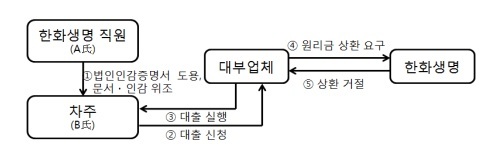 보험회사 서류는 법적으로 지급보증 효력이 없지만, A씨는 한화생명 직원이 만들어준 가짜 법인인감증명서와 가짜 지급확약서로 대부업체에서 30억 원을 빌린 후 잠적했다. 위조된 지급확약서는 ‘A씨의 대출금을 90일 내에 한화생명이 지급(상환)한다’는 내용이다.
